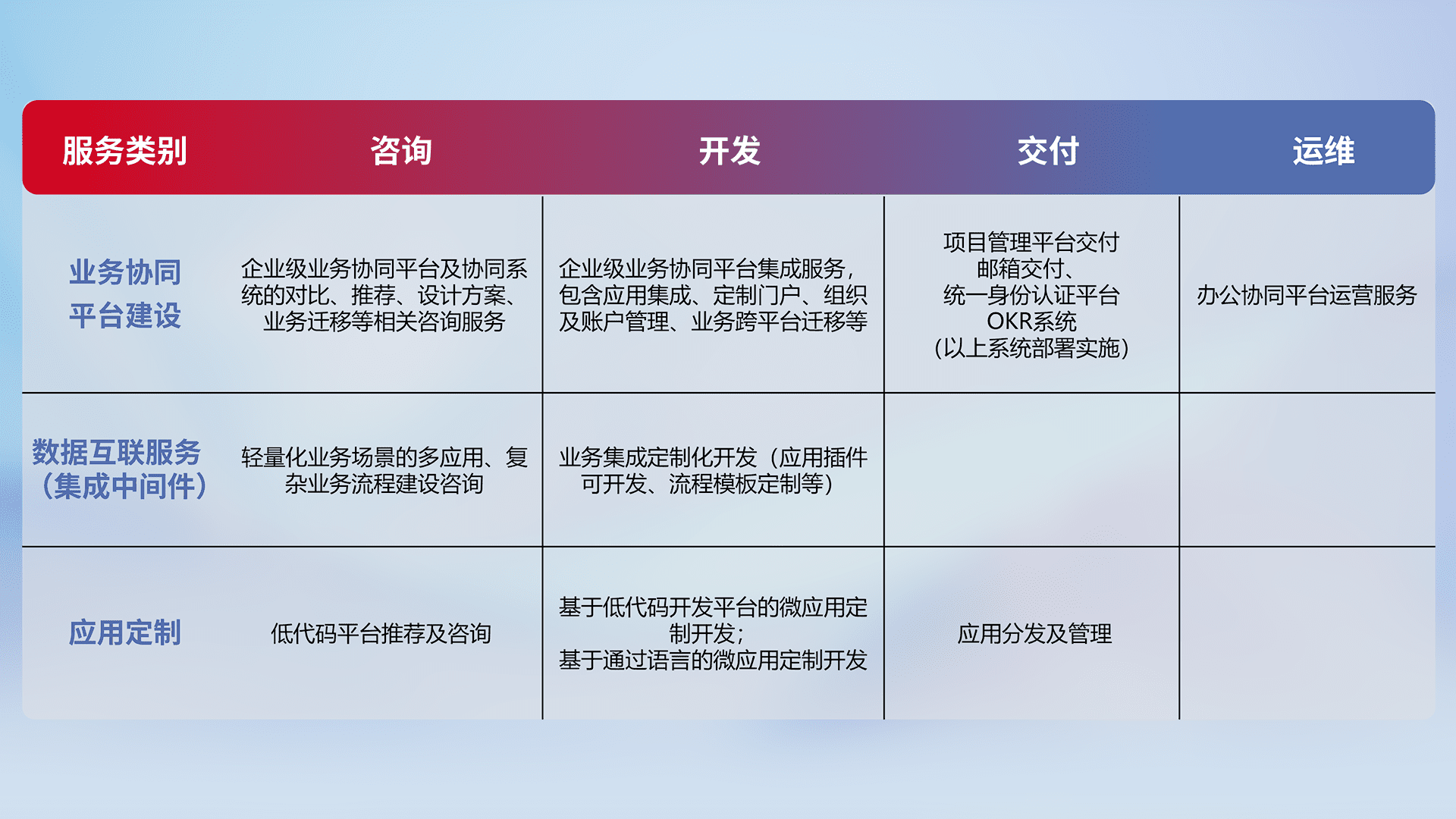 针对钉钉、、企微、、、、IDaas等平台级产品提供产品的规划、、、、方案、、、交付、、定制化开发等服务,,,实现如统一协同办公、、智能客户服务、、、混合会议管理、、智能数据查询、、、等业务场景,,,实现数字化转型。。。。